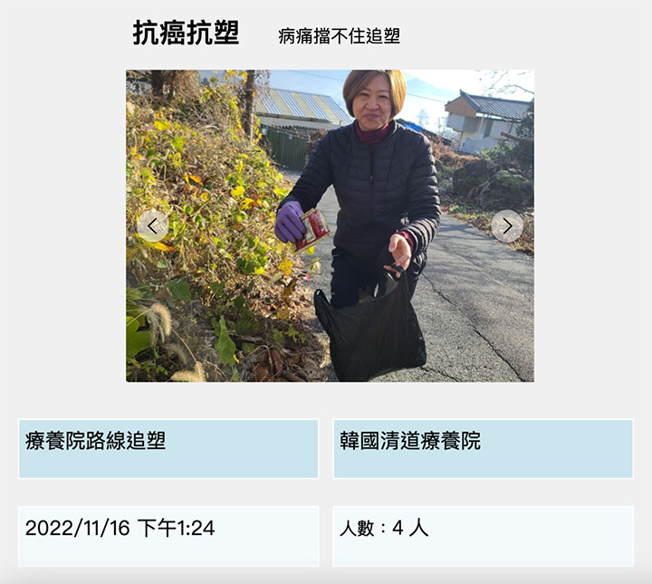 參與者除了台灣本地、還有來自日本、韓國、美國、加拿大、義大利等地關心環境的朋友們。其中,韓國大邱四位癌症患者組成「抗癌抗塑」,撿除垃圾像為地球拔出癌細胞般感到一身輕鬆;在台灣彰化的農友組成「農地減塑的挑戰」,發現灌溉水路的垃圾和農地資材垃圾也多是一次性塑膠製品;在台灣和美國都各有愛好溪流的淨溪人士,持續定期的淨溪行動;有追星客在海拔最高的合歡山暗空公園參與淨山活動;最動人的一幕是由隊名「默默無名」的小學生們在公園撿拾菸蒂時,正在抽菸的老爺爺們主動表示,以後菸蒂都會丟進垃圾桶。