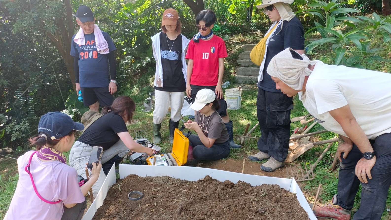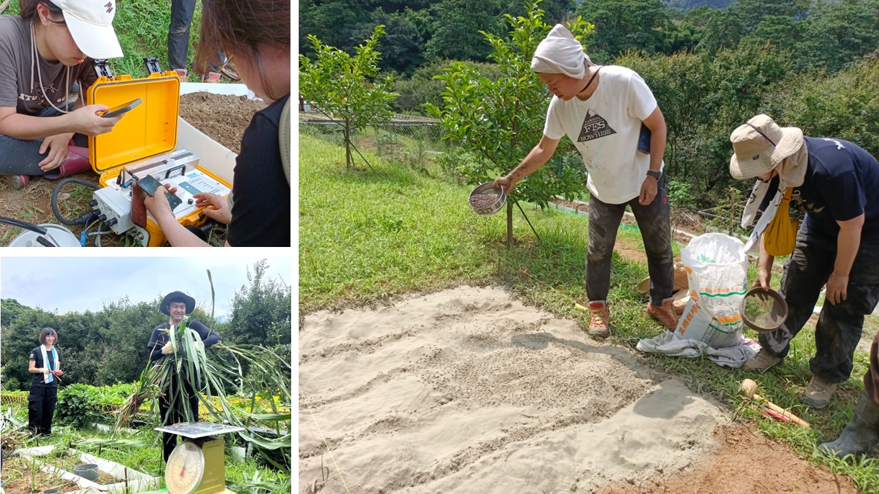 首先,日本學者於2023年5月來到三芝農場拜訪,並實地採土調查土壤特性。八月,實驗開展前,先做各種前行準備,慈心義工協助除草、搬運來自日本的玄武岩粉並秤重分裝。並特別請當地農友陳銀昌指導中耕機整地,將三塊梯田分成12區,分別是1)無添加任何改良劑、2)添加玄武岩粉末、3)加有機質肥、4)玄武岩粉末與有機質肥合併施用,最後,將量測機器設定與架設定位,之後定期照顧作物並觀測。