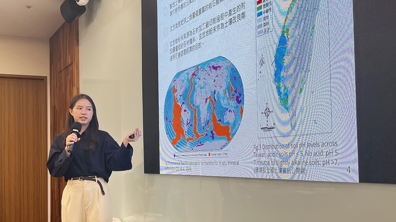 台大農化系研究生李芳慈發表實驗結果,並表示玄武岩廣布全球開採成本低,且多利用礦場切割過程產生的廢料,也是一種循環經濟。