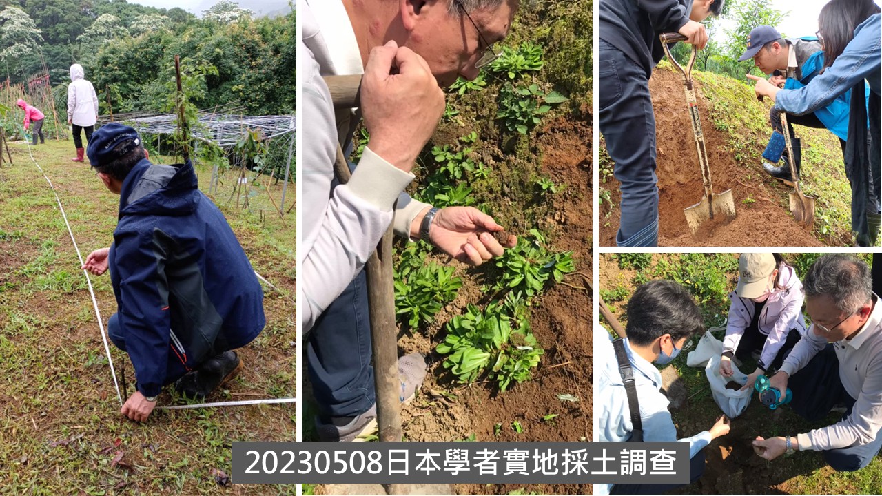 (左四起)台大農化系研究生李芳慈、日本京都府立大學關真由子博士、農地主人顏錫文先生、慈心基金會蘇慕容執行長、京都府立大學中尾淳副教授、台大農化系許正一教授、台北慈心推廣課吳雪美課長