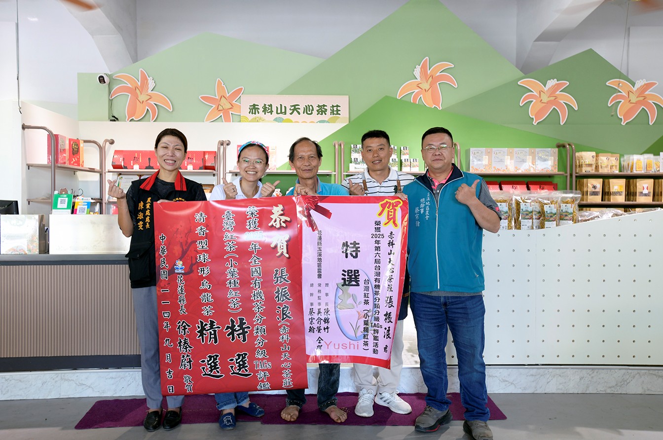 花蓮赤科山天心茶園的好茶連連得獎,拿下2025年世界綠茶大賽金賞獎、第六屆臺灣有機茶分類分級TAGs評鑑5項大獎、新北市有機好茶分類分級評鑑一金四銀獎項。為赤科山好茶再一次在競賽中大放異彩。2024年首次參加全國有機清香球型組比賽,即勇奪特選獎。茶園主人張振浪笑著執壺泡茶,侃侃談著自家創意烘焙的雀舌皇宮茶,已於2023年申請註冊商標權,茶湯色澤、香氣、滋味層次豐富,不遑多讓自家得獎茶。一步步打造自有品牌產品,型塑商品差異化服務,一步一腳印,一葉一心意。