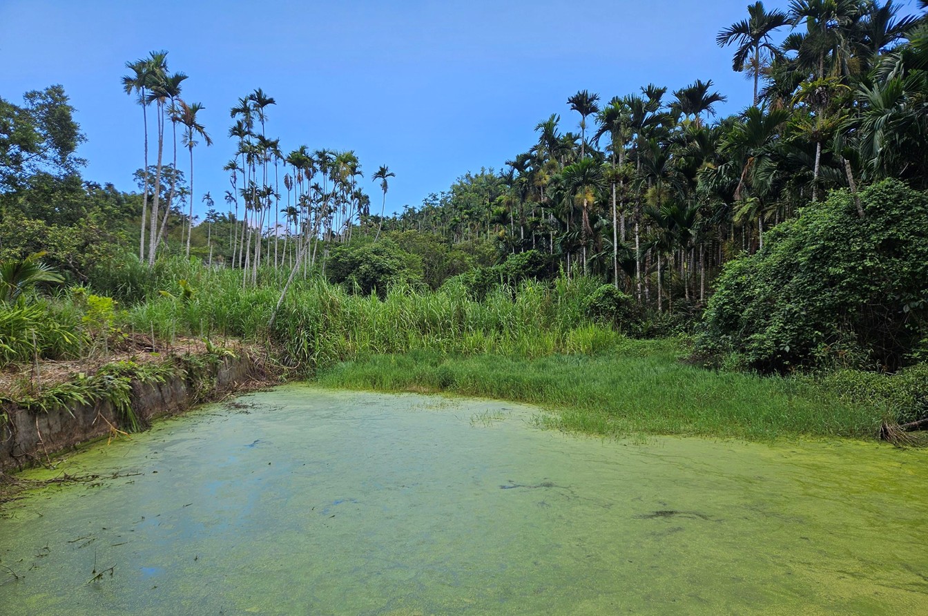 長滿浮萍的水池,評審委員提醒浮萍須適度清除。