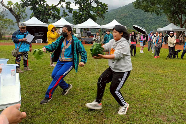 趣味競賽-「布農水手」,運用芋葉植物取水,看誰跑得快,取得的水最多!