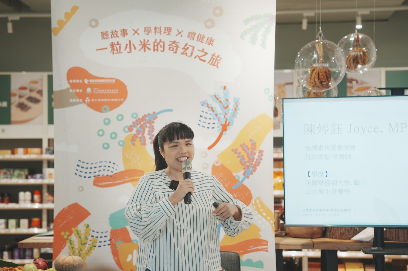 緊接著,營養師陳婷鈺則以科學數據解構民眾對於澱粉與穀物的迷思,強調小米不僅具有低升糖指數,適合血糖控制,且蛋白質和支鏈胺基酸(白胺酸)含量在常見穀物中名列前茅,有助於肌肉合成與代謝。相較之下,小米營養價值高於糙米且含鐵量豐富,為素食者及健康飲食者提供極佳選擇。陳婷鈺亦分享植物性飲食的環境友善與經濟實惠優勢,鼓勵大眾採用全素飲食模式,因小米與多樣豆類的結合更能提升飲食品質與健康。從營養、碳排、成本三方面來看,小米都展現優勢,既能滿足口腹之慾,也能成為看得見的氣候行動。